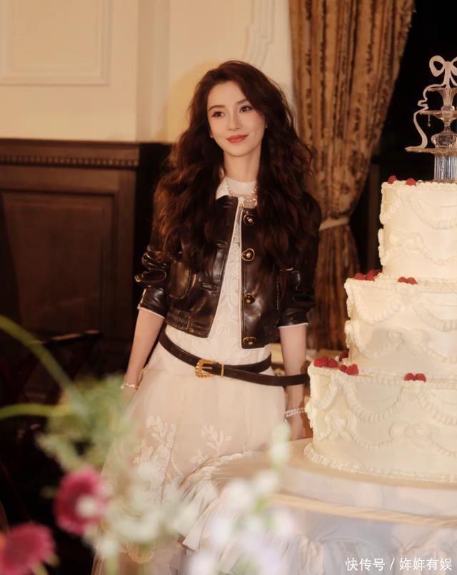 还有一张她站在蛋糕旁边的照片,穿了另一套衣服的她,又从公主变成了时尚达人,一条充满仙气的白裙子,外边搭配了一件棕色皮衣,长发披散在两边,这个造型跟千鸟格“公主”造型比起来,居然不相上下!